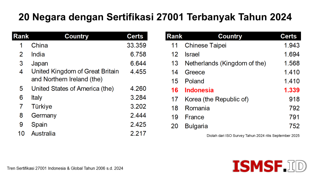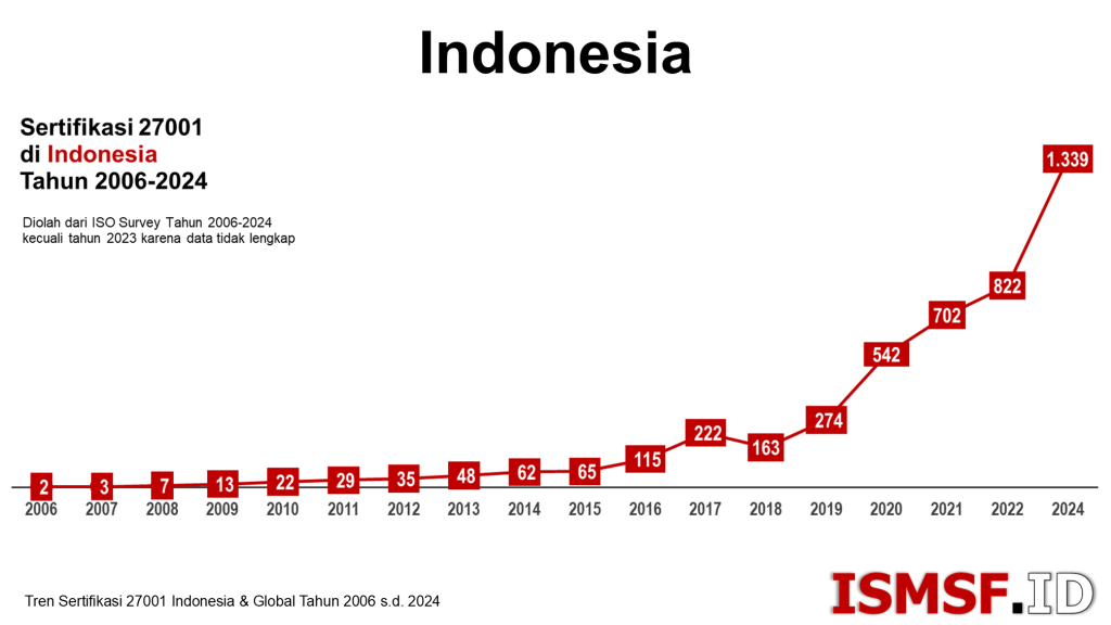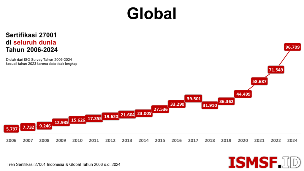 Tren Sertifikasi 27001 di Indonesia dan Global dari tahun 2006 sampai dengan tahun 2024. Diolah dari hasil survei ISO dan IAF tahun 2006 s.d. 2024 yang terakhir dirilis September 2025, kecuali tahun 2023 karena data tidak lengkap.